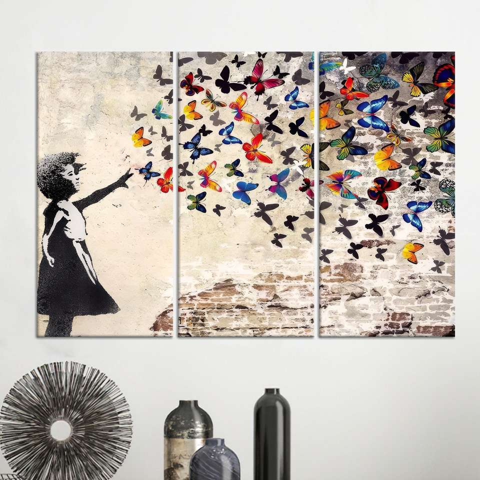 ภาพพิมพ์กราฟฟิตี้เด็กหญิงกับผีเสื้อ: งานศิลปะบนผ้าใบแนวเมือง ชุดผ้าใบ 3 ชิ้น
