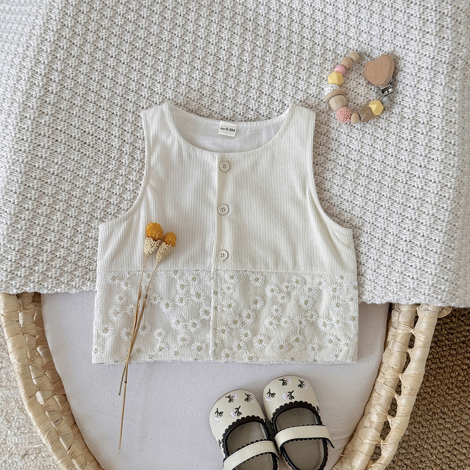 เสื้อคาร์ดิแกนผ้าตาข่ายลายดอกไม้สำหรับเด็กผู้หญิง, เสื้อตัวเล็กสไตล์เกาหลีน่ารักคอกลมทรงหลวมแขนกุดสวมใส่ได้ทุกวันในฤดูใบไม้ผลิฤดูใบไม้ร่วง