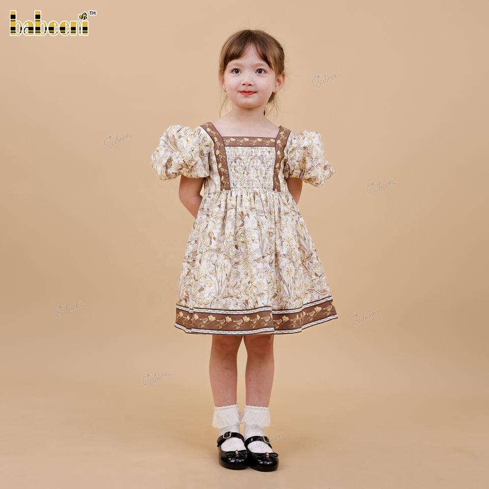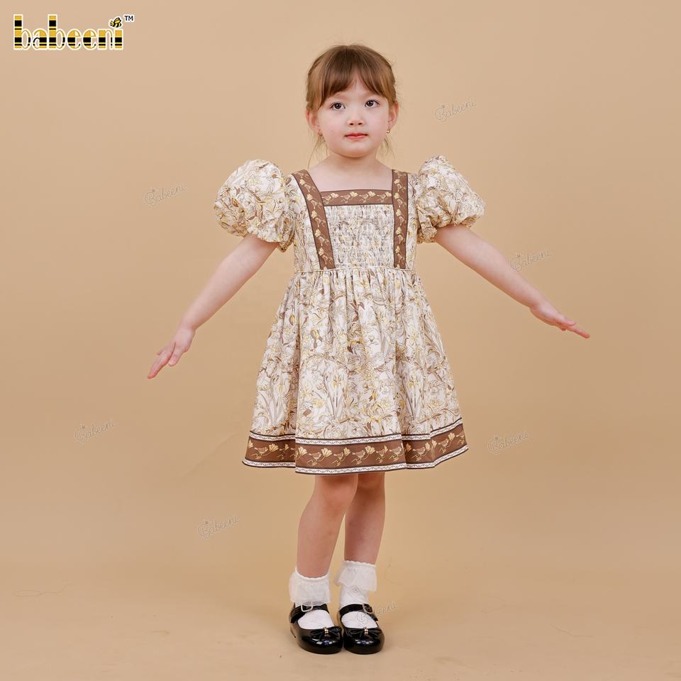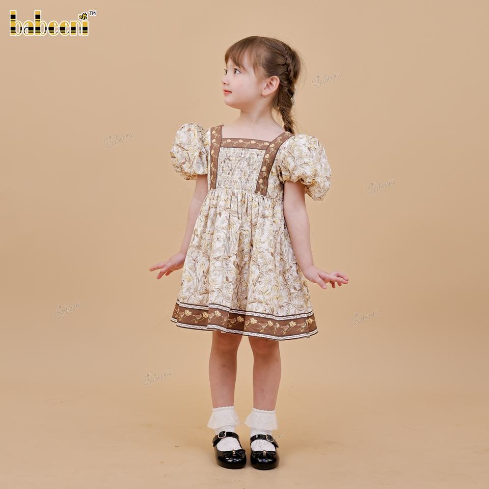 ชุดเดรสลำลองลายดอกไม้สำหรับเด็กผู้หญิง พร้อมเสื้อท่อนบนแบบ Kansai แต่งสม็อค ผ้าฝ้าย 100% ระบายอากาศได้ดีและซักได้ ทรงเอไลน์ ODM-DR4539