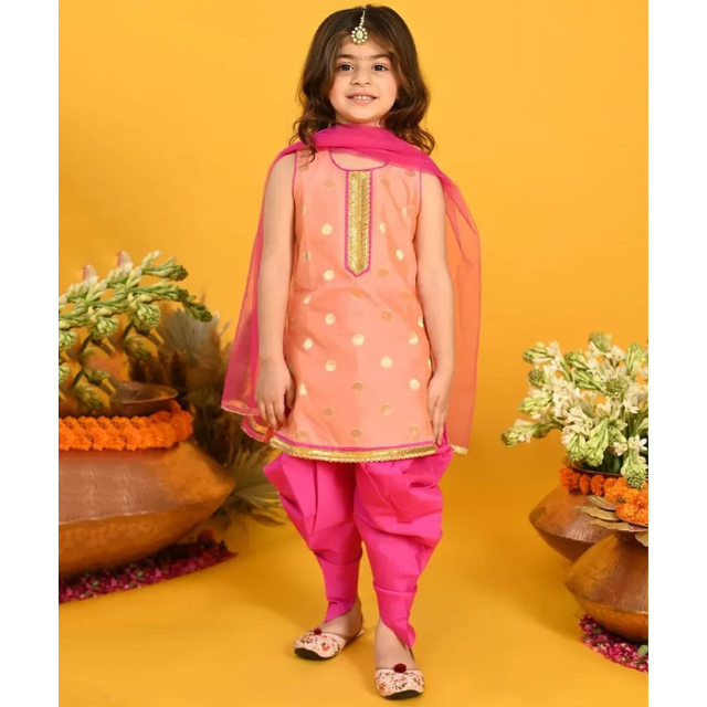 ชุดเลเฮนกาโจลีสไตล์ปัญจาบสมัยใหม่สำหรับเด็กผู้หญิง ชุดคุร์ติปักลายสีพีช กางเกงปาเตียลาสีชมพู ผ้าคลุมไหล่สำหรับงานปาร์ตี้