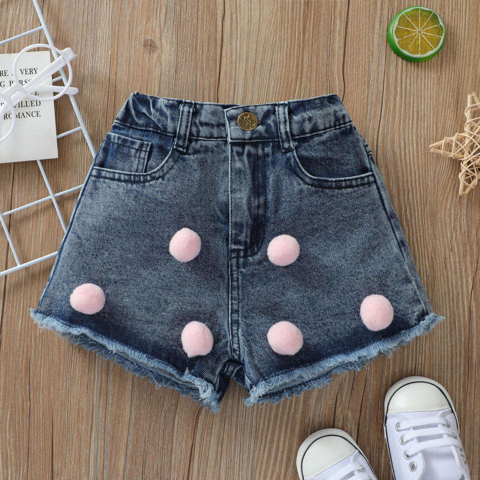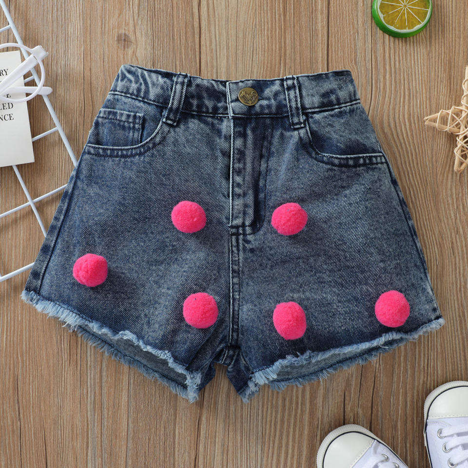 กางเกงขาสั้นเด็กผู้หญิงสีพื้น แต่งกระดุมยางยืด กระเป๋าซิป น่ารัก ลายลูกบอล เสื้อผ้าฤดูร้อน กางเกงยีนส์เด็ก พร้อมตัวอย่างสินค้าฟรี