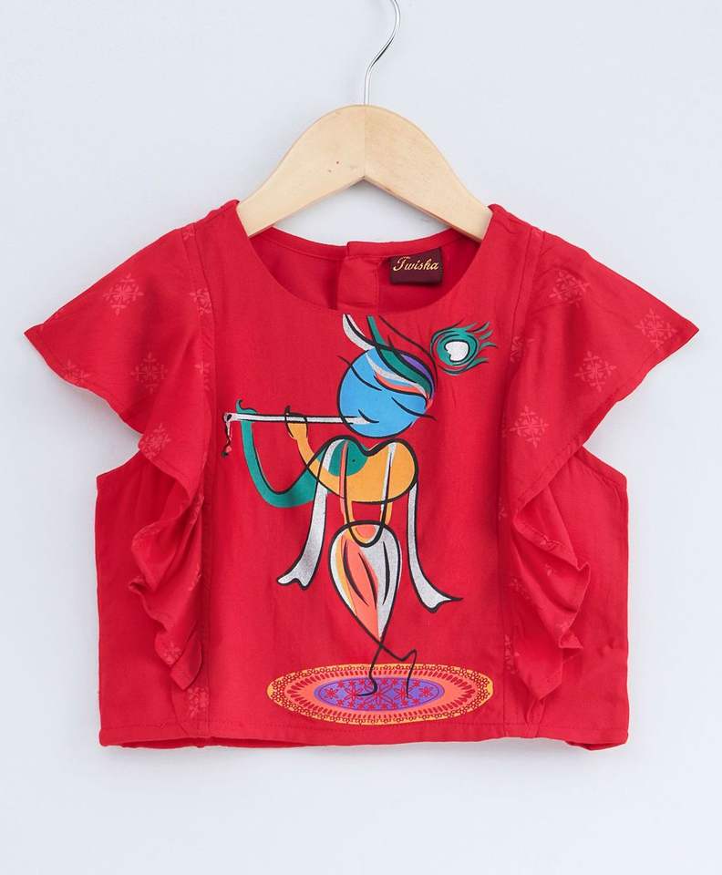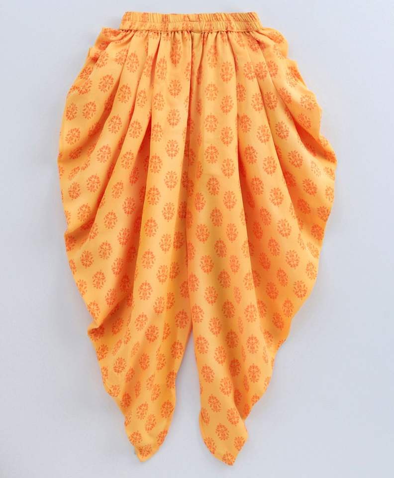 ชื่อสินค้า:เสื้อแขนสั้นลายพิมพ์สำหรับเด็กผู้หญิง & กางเกง Dhoti ลายพิมพ์ - สีแดงและสีเหลือง