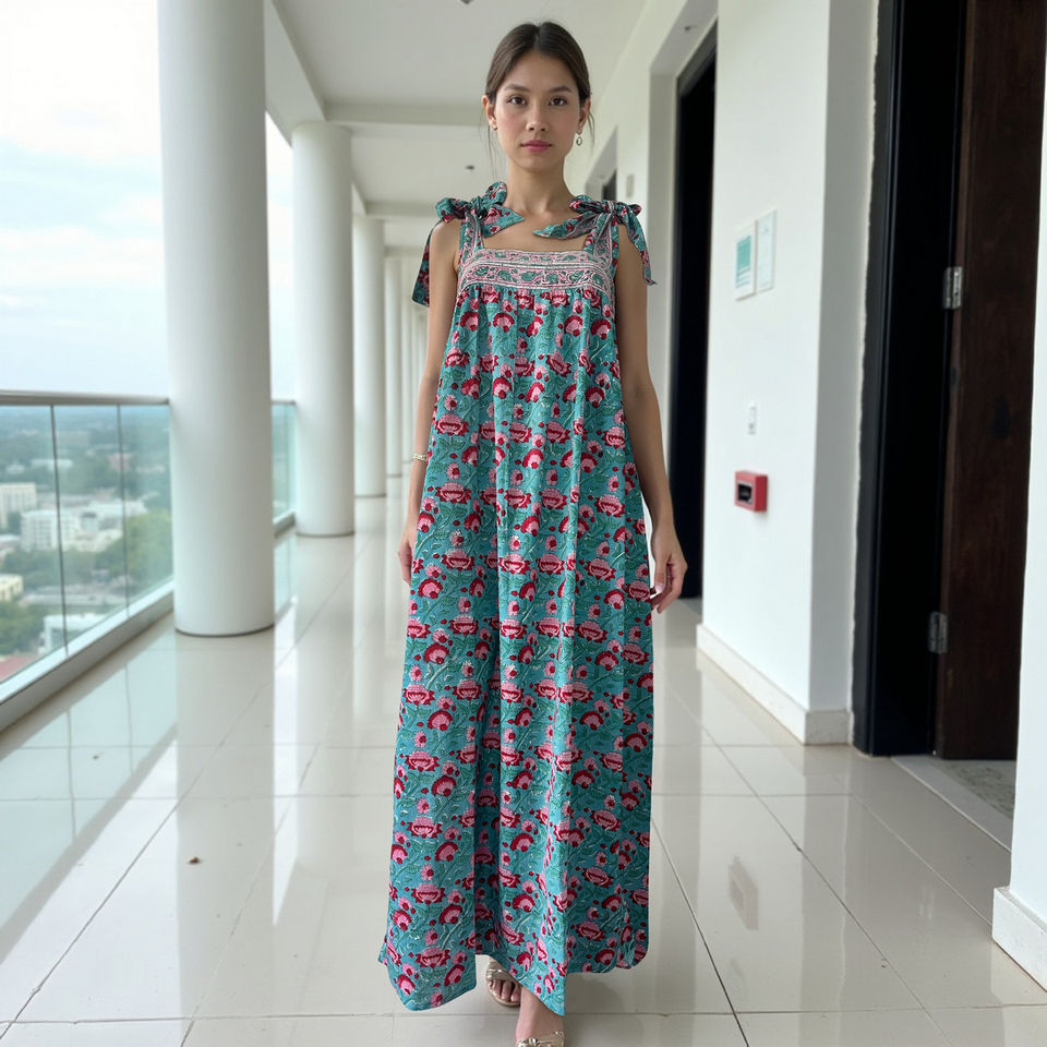 Girls weekend ready sleeveless maxi in breezy cotton with tie straps square neckline ethnic floral red white pops Tie Strap