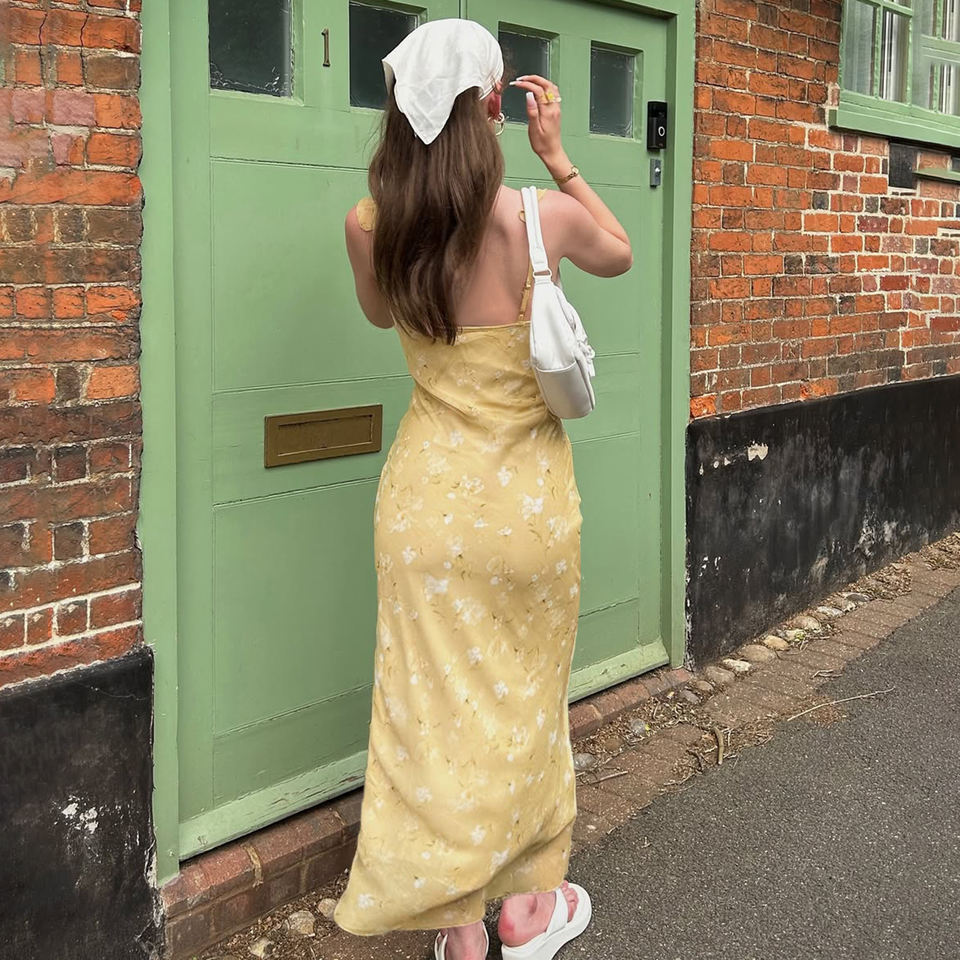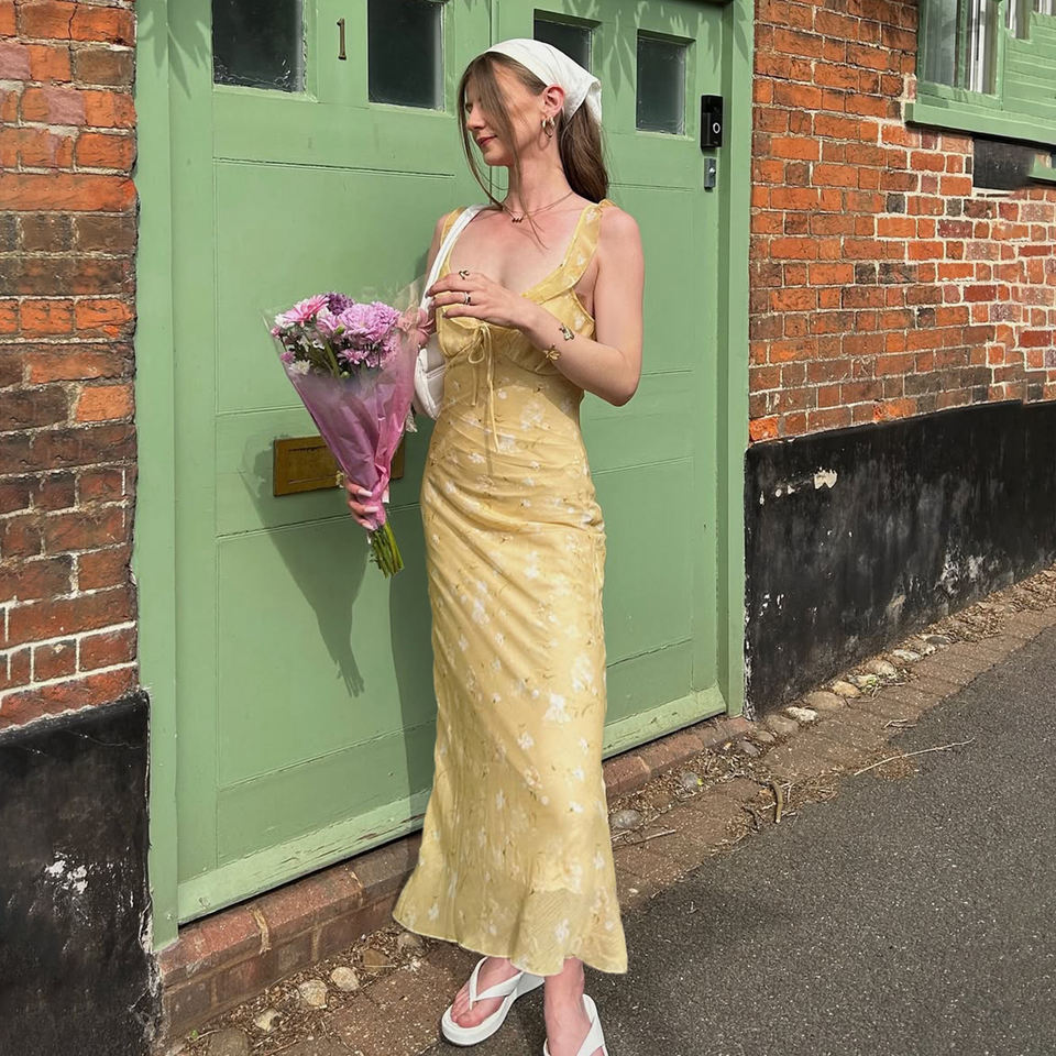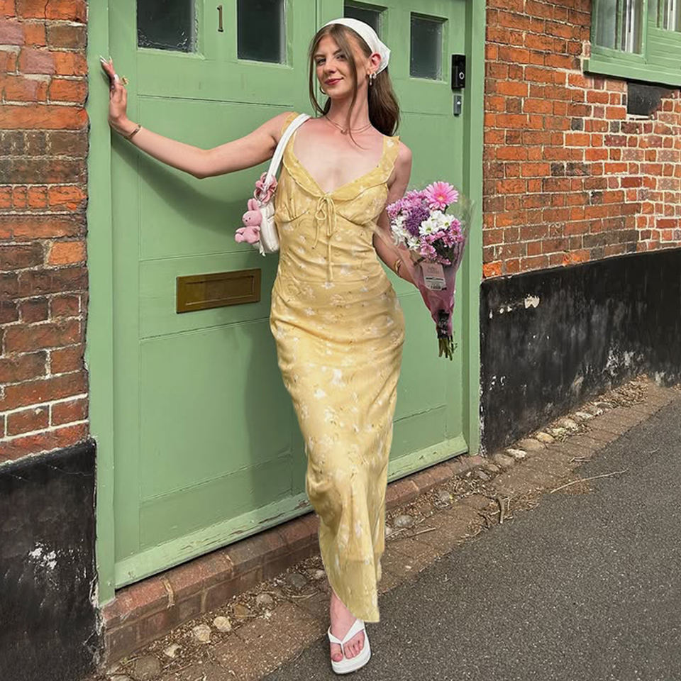 สไตล์สาวหวาน ชุดเดรสพิมพ์ลายดอกไม้ แต่งระบาย ชุดเดรสยาวสำหรับวันหยุด ชุดเดรสเก๋ไก๋โรแมนติกหรูหรา