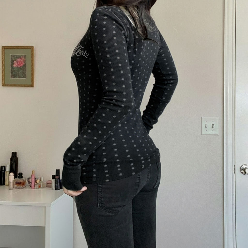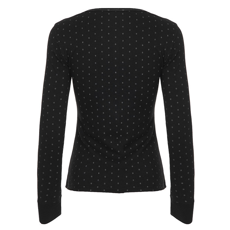 เสื้อยืดแขนยาวทรงเข้ารูปสไตล์วินเทจ คอทรงกลม ติดกระดุม ลายจุดสีตัดกัน สไตล์สาวหวาน ใส่ได้หลากหลายโอกาส