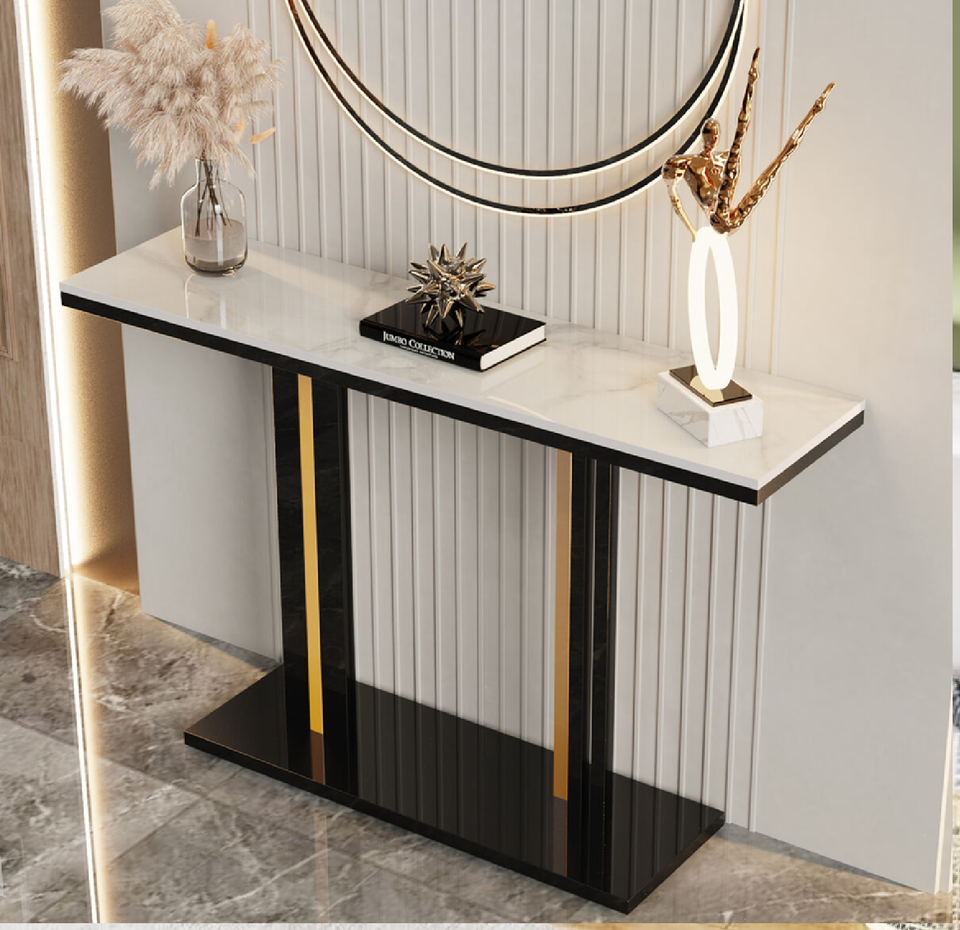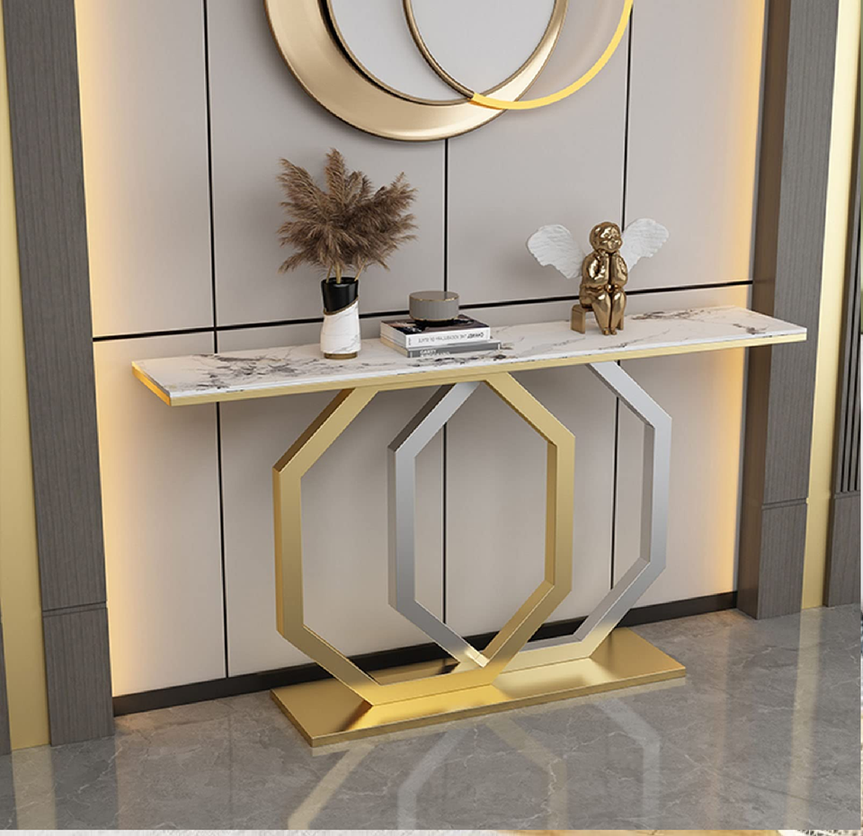 โต๊ะคอนโซลทรงเรขาคณิตสีทองสวยงามด้านบนหินอ่อนโต๊ะทางเข้าที่ทันสมัยการออกแบบที่โดดเด่นมีอยู่ในอัตราขายส่ง