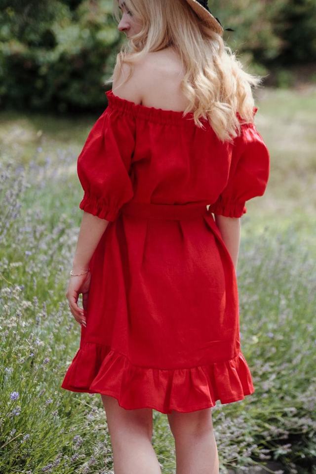 ชุดเดรสสไตล์โบฮีเมียนสีแดงสไตล์โบฮีเมียนสวมชุดเดรสผ้าลินิน100% เปิดไหล่พร้อมเข็มขัดเพื่อกระชับชุดเดรส