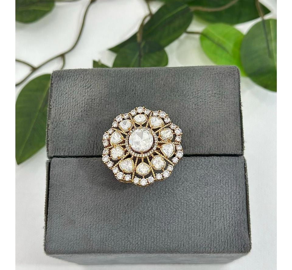 แหวนทองชุบคุณภาพพรีเมียม ดีไซน์หรูหราทันสมัย ประดับเพชรซิคอนและคุนดัน ปรับขนาดได้ เหมาะสำหรับงานแต่งงานและงานปาร์ตี้สำหรับผู้หญิง