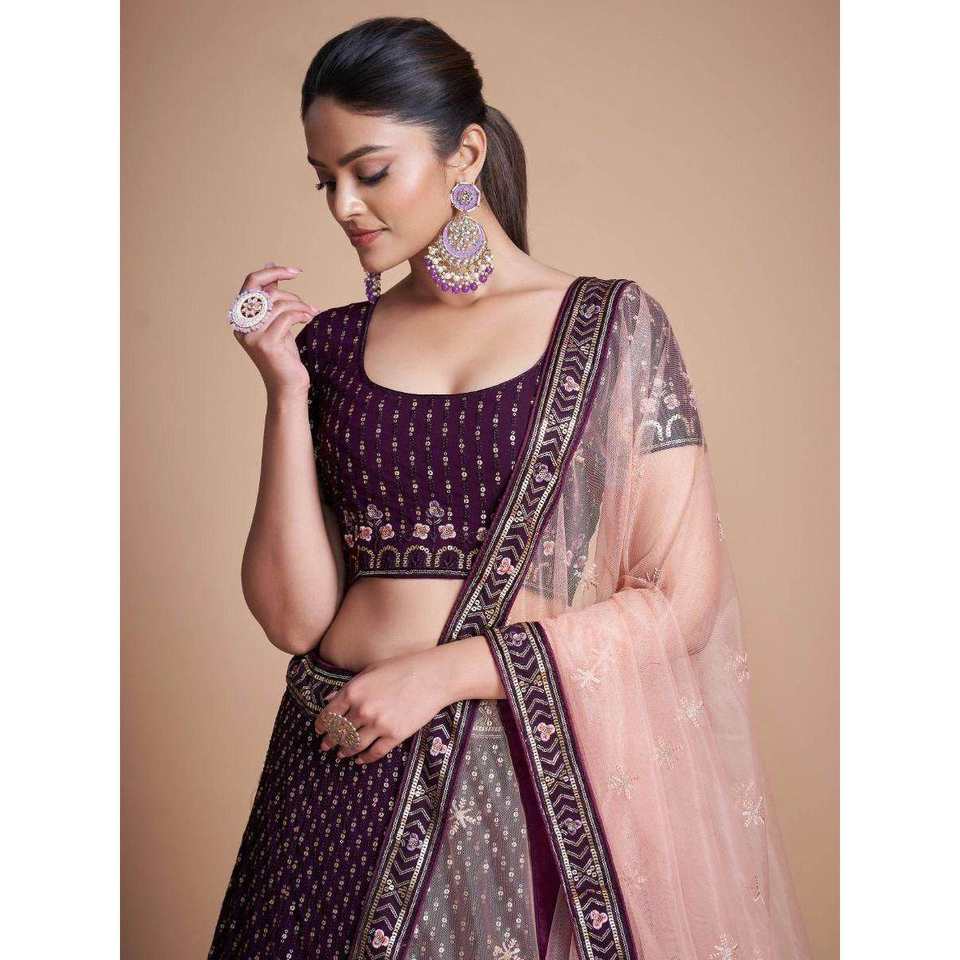 ชุดเลเฮนกาโชลีผ้าจอร์เจตต์ปักลายสีม่วงหรูหราสำหรับผู้หญิง