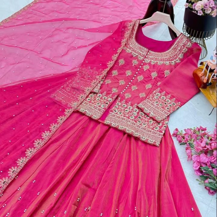 ชุดเลเฮนกาโชลีสไตล์อินเดีย-ปากีสถานสำหรับผู้หญิง ประดับเลื่อมและงานปักอย่างสวยงาม พร้อมผ้าคลุมไหล่แบบดั้งเดิม เหมาะสำหรับงานปาร์ตี้ ใส่ได้รวดเร็ว