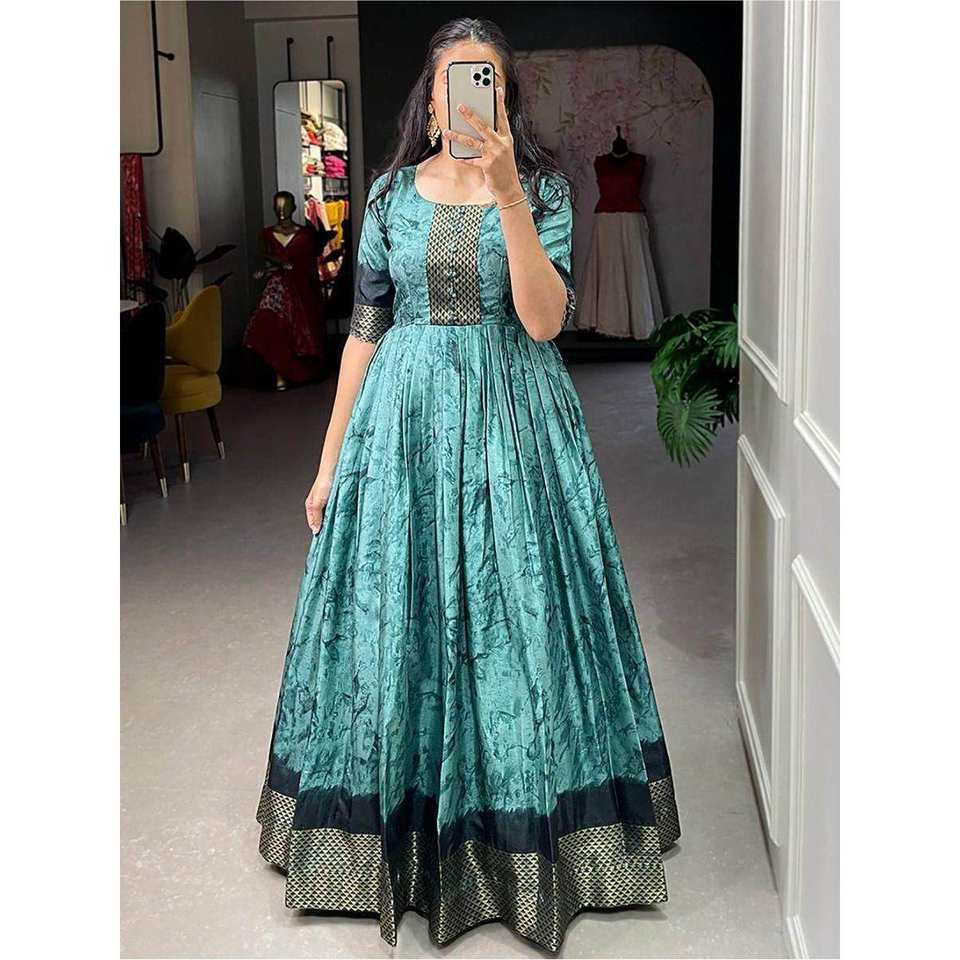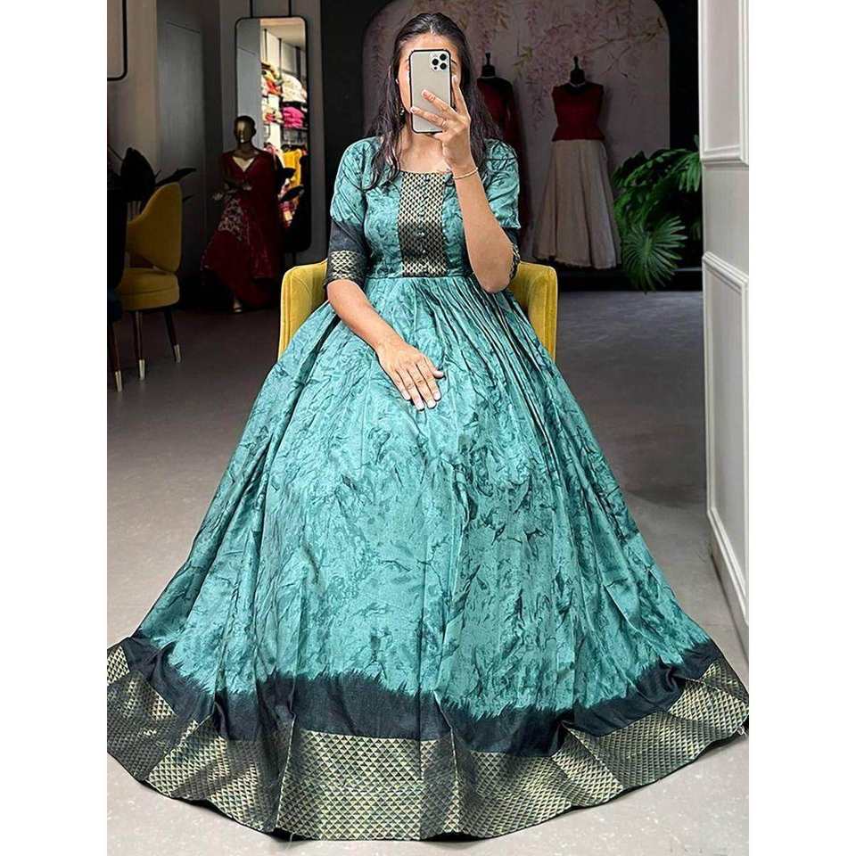 ชุดราตรีผ้าไหมพิมพ์ลายชิโบรีสีฟ้าอมเขียวสุดหรู พร้อมสวมใส่สำหรับงานแต่งงาน