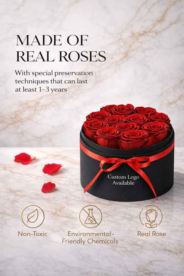 ดอกกุหลาบอบแห้ง 12 ดอก รูปทรงยาว คงทนนาน 3-5 ปี กล่องของขวัญดอกไม้สุดหรูสำหรับคุณแม่ ภรรยา วันวาเลนไทน์