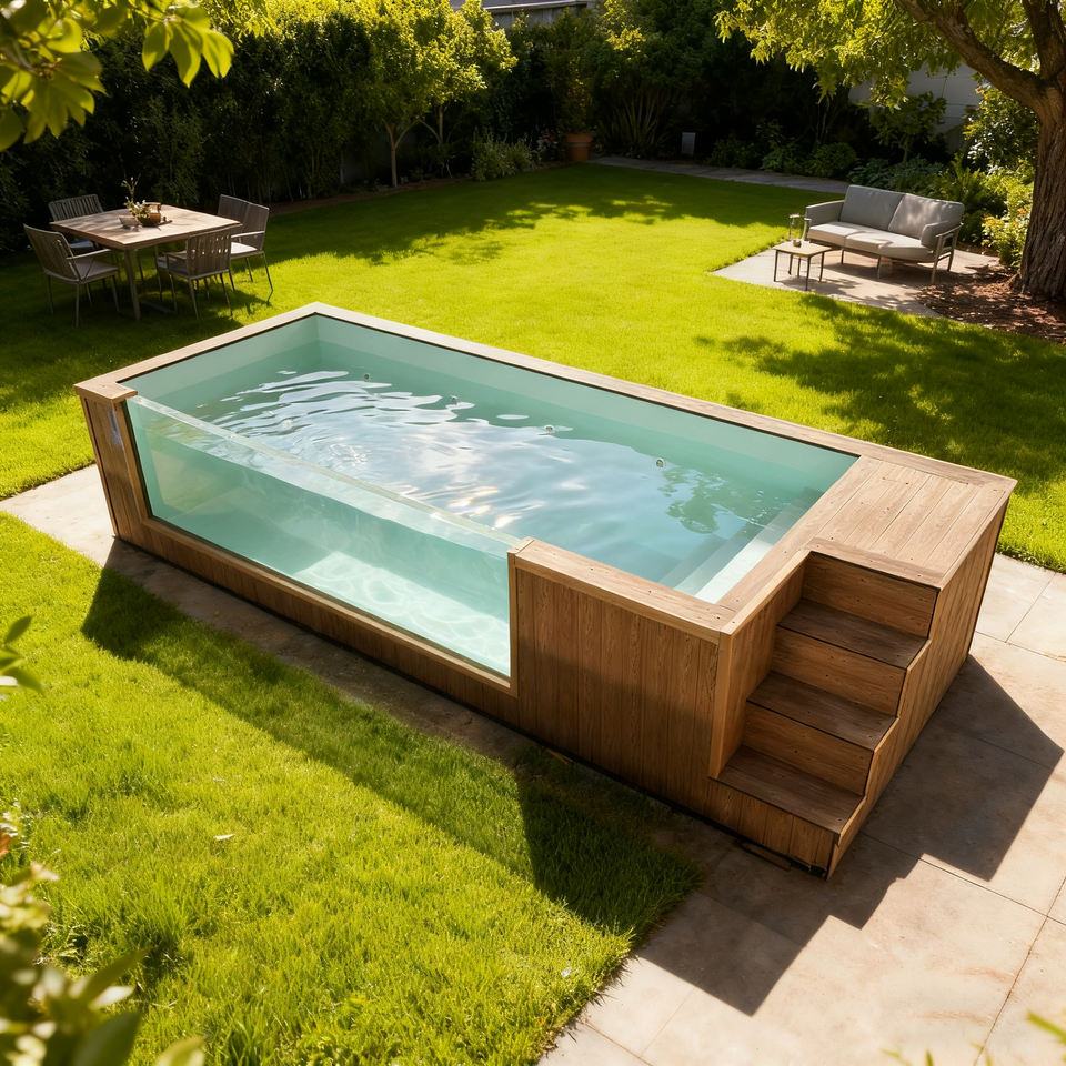 สระว่ายน้ำโครงสร้างไฟเบอร์กลาส/FRP พร้อมพื้นไม้รอบด้าน ระบบปั๊มกรองน้ำไหลแรงในตัว ทนทานต่อรังสียูวี เหมาะสำหรับใช้ในบ้าน
