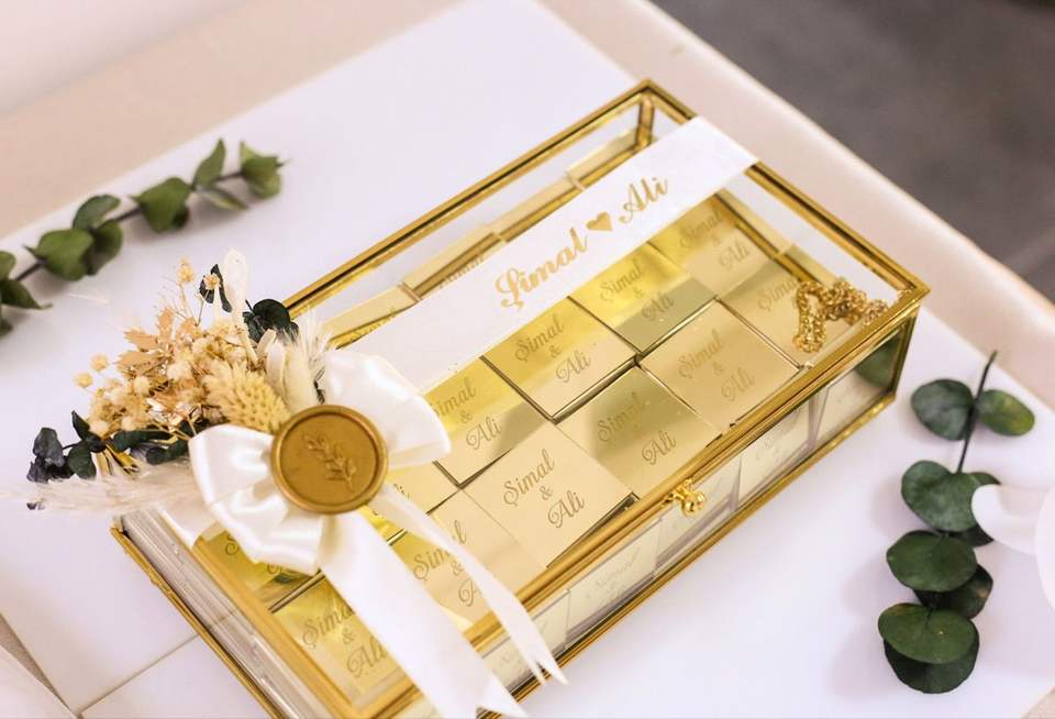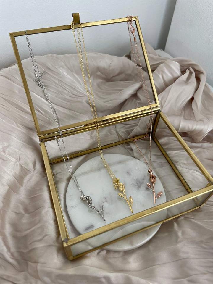 กล่องใส่เครื่องประดับทรงสี่เหลี่ยมหรูหรา ทำจากกระจกเคลือบทอง เป็นมิตรกับสิ่งแวดล้อม ปรับแต่งได้ พร้อมฐานทองเหลืองและกระจกสำหรับจัดเก็บเครื่องประดับ
