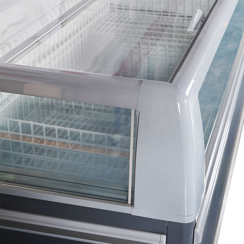 ตู้แช่เกาะทำจากแก้วสำหรับอาหารแช่แข็งในซูเปอร์มาร์เก็ต