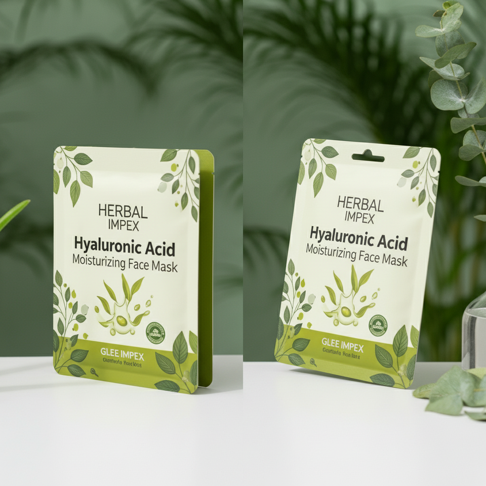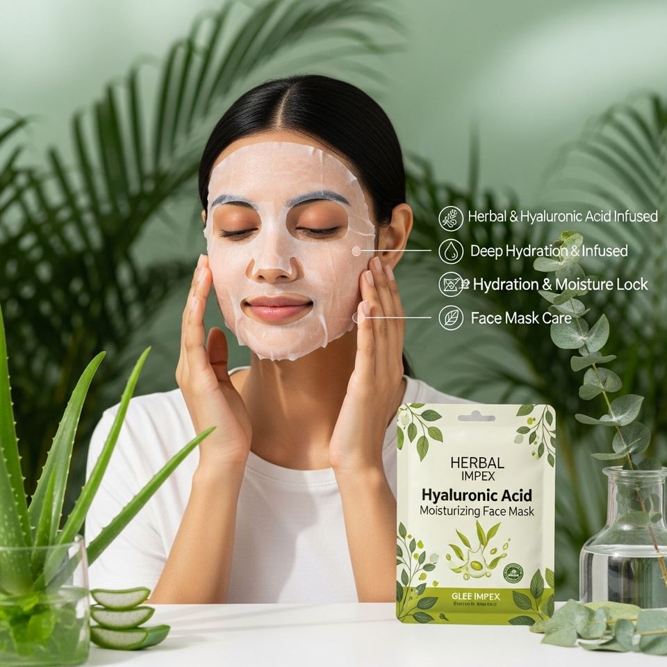 แผ่นมาส์กหน้า Glee Impex ไฮยาลูรอนิค แอซิด บำรุงผิวชุ่มชื้นและเติมน้ำลึก สำหรับทุกสภาพผิว กลิ่นสมุนไพรอ่อนโยน ขนาดทดลอง