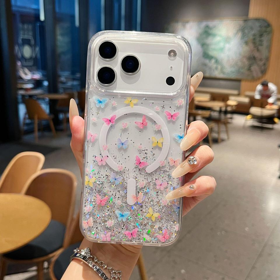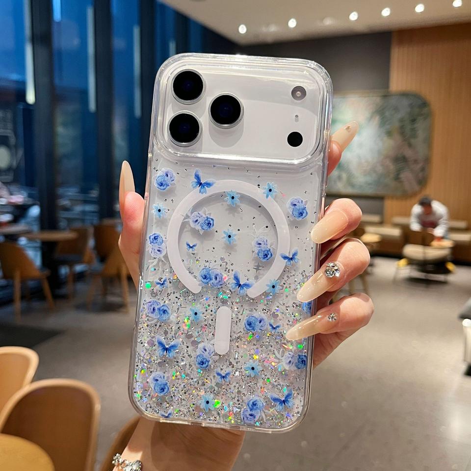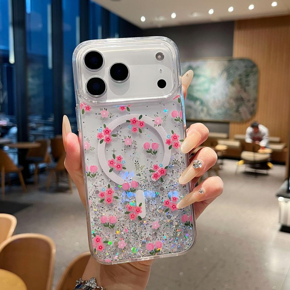 เคสโทรศัพท์แม่เหล็กกันกระแทกเรซิ่นกลิตเตอร์&ฟลอรา | วัสดุ TPU ที่ยืดหยุ่นได้ | การออกแบบลวดลายที่ปรับแต่งได้ | เคสแบบนิ่มป้องกันเต็มรูปแบบ