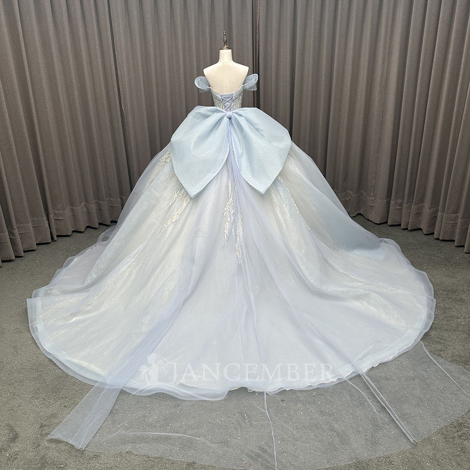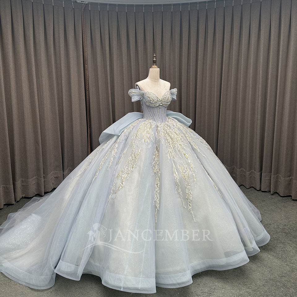 ชุดเดรสแวววาวแวววาวความยาวถึงพื้นสีฟ้าอ่อน appliques ผ้าซาตินยาวถึงเอวธรรมชาติชุดสำหรับปาร์ตี้15 16 LSMC82