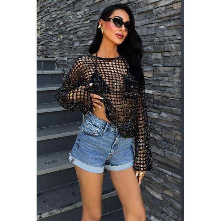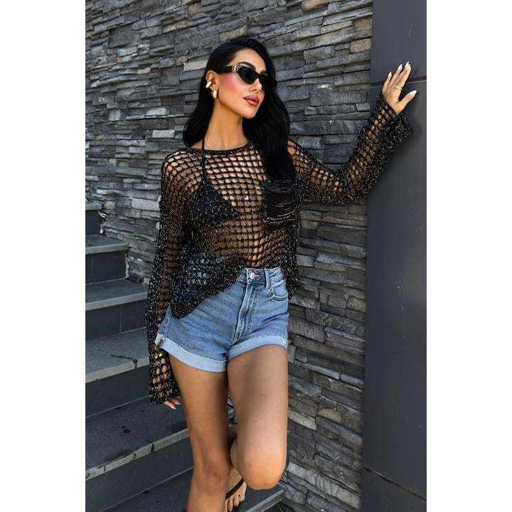 เสื้อเบลาส์ถักลายฉลุวิบวับ 1361 ดีเทลกระเป๋าสำหรับโอกาสงานปาร์ตี้
