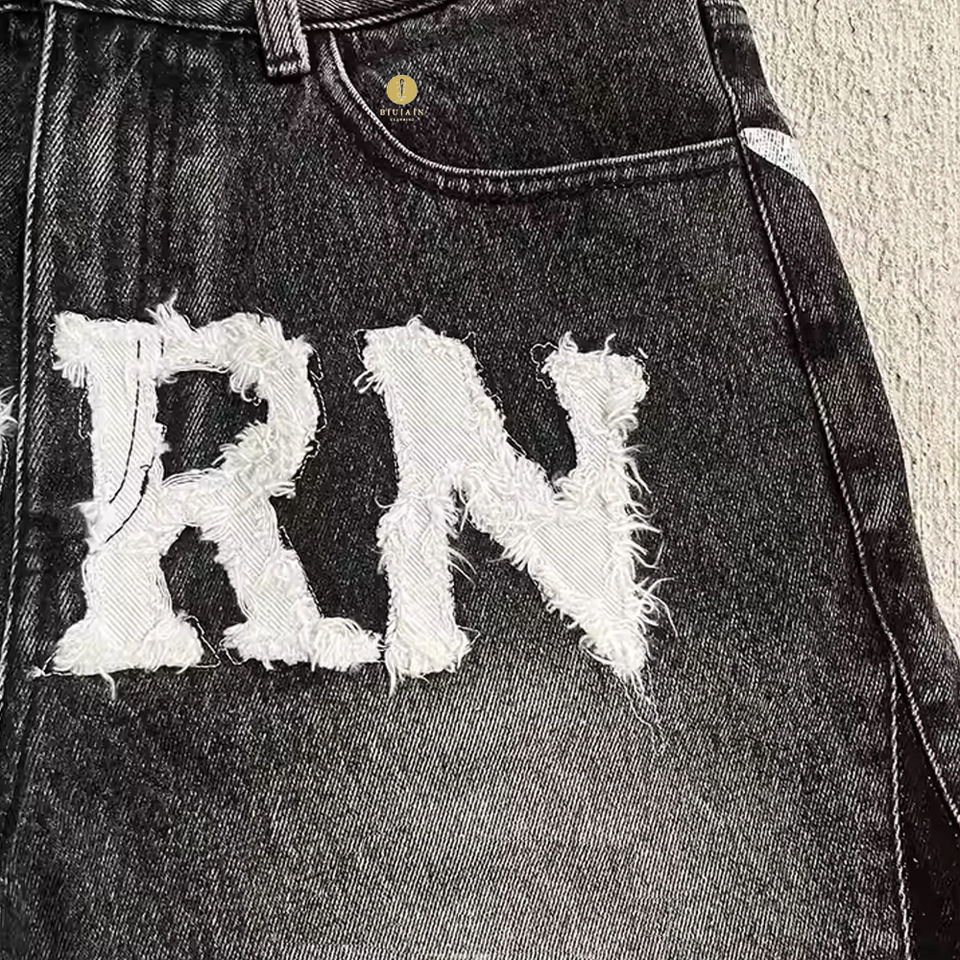 กางเกงยีนส์ขาสั้นเดนิมสีดำฟอกทรงหลวมสไตล์สตรีทแวร์ ปักลายโลโก้ขอบดิบ ตกแต่งด้วยผ้าปะติดพิมพ์ลาย ผ้าฝ้ายแท้ 100% ยี่ห้อ Glory Custom