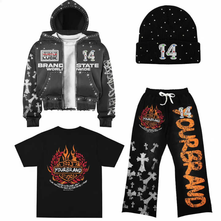 ชุดเซ็ตเสื้อฮู้ดดี้และกางเกงวอร์มสไตล์วินเทจ ย้อมสีแบบ Acid Wash แต่งคริสตัล ทรงโอเวอร์ไซส์ แบบครอป ซิปหน้า สำหรับผู้ชาย
