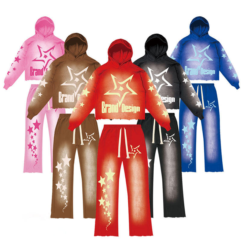 ชุดเซ็ตเสื้อฮู้ดครอปและกางเกงจ็อกเกอร์ปักลายโลโก้ตามสั่ง Glory Hot Sell พร้อมงานย้อมสีแบบ Acid Wash สำหรับผู้ชาย