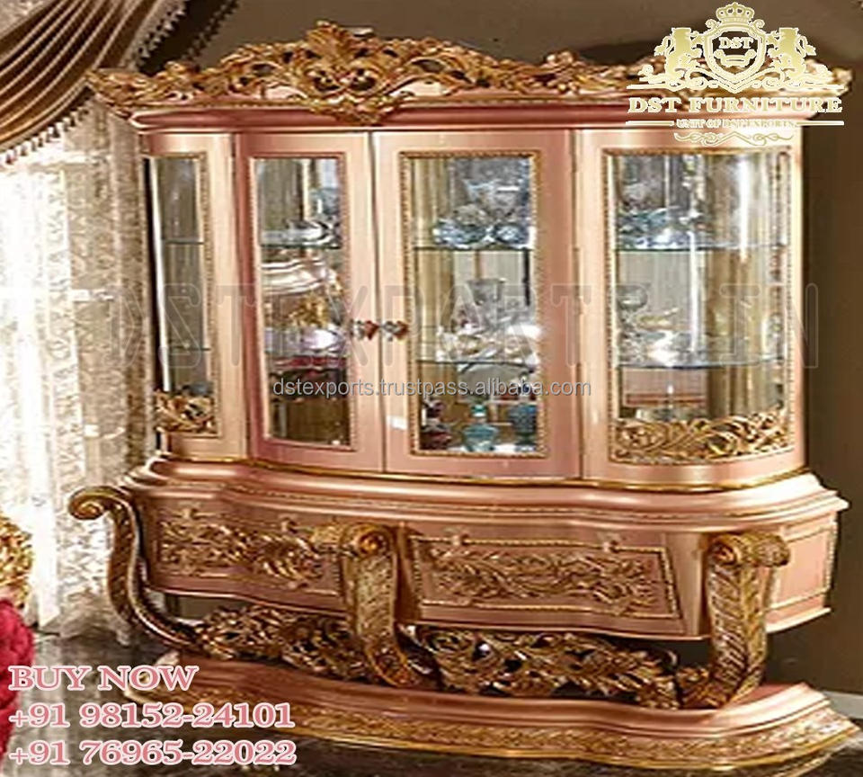 Curio ไม้สักสำหรับพื้นที่รับประทานอาหารฝรั่งเศสสไตล์บาร็อคแกะสลักด้วยมือตู้คู่ประตูแกะสลักด้วยมือ