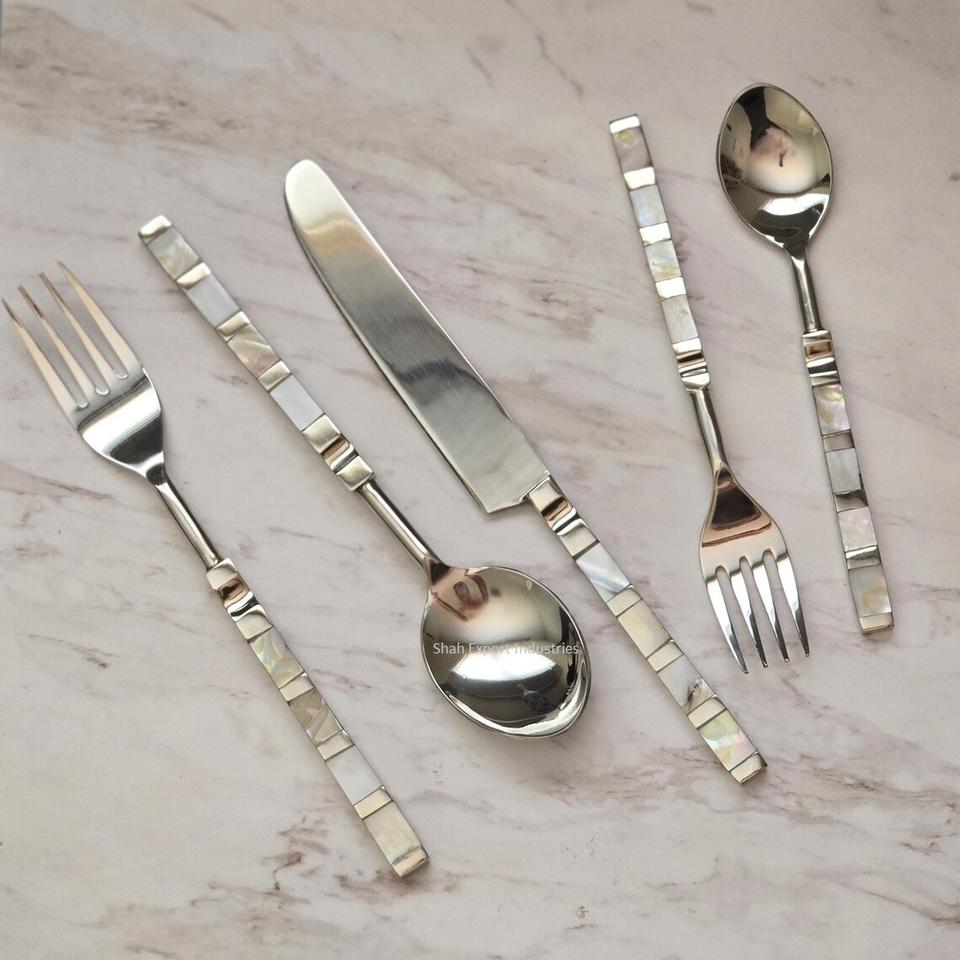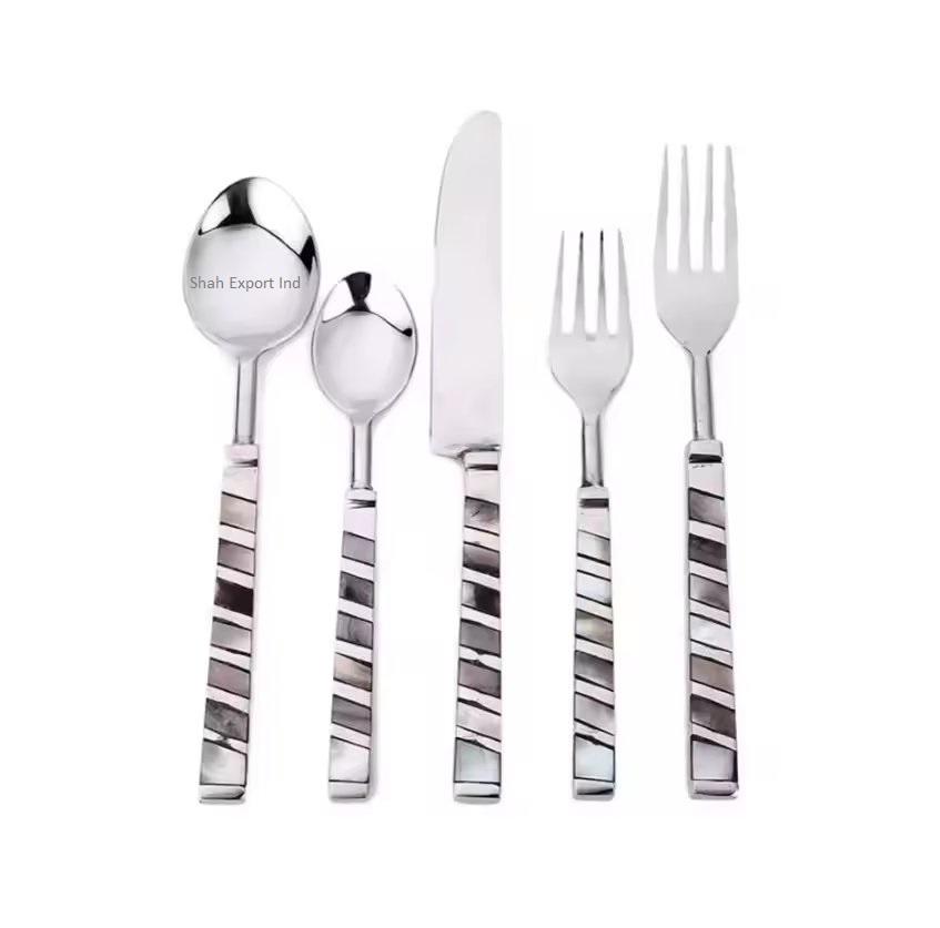 ชุดช้อนส้อมสแตนเลสสีทองมันวาวพร้อมด้ามแม่มุกฝังสำหรับบ้านและโรงแรมชุดเครื่องใช้บนโต๊ะอาหาร