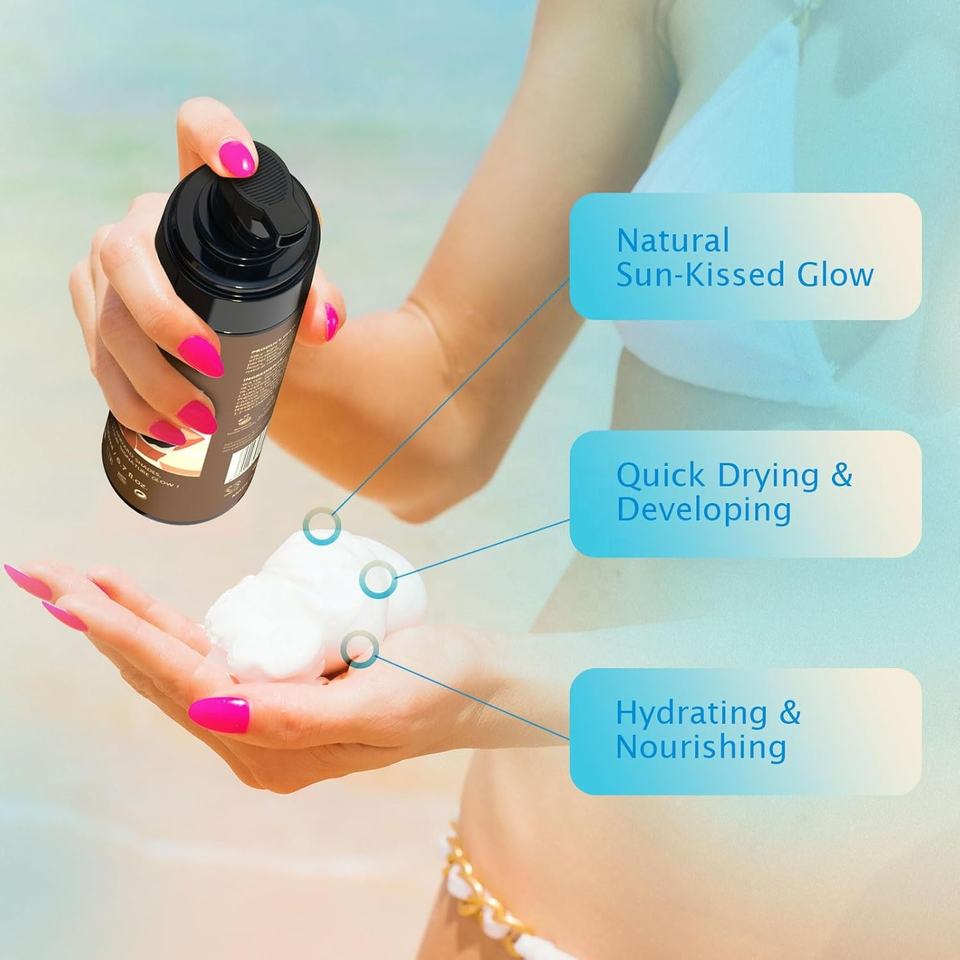 มูสทาผิวเรืองแสง Glow Instant Sun, ผลิตภัณฑ์สำหรับผิวแทนสีบรอนซ์เข้มข้นพิเศษ, บรอนเซอร์ทาผิวแทนแบบไม่ต้องโดนแดด, ผิวแทนปลอมที่ดูเป็นธรรมชาติ