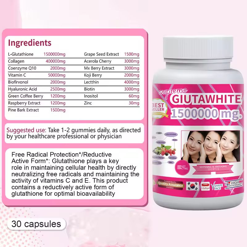 กลูตาไธโอนแคปซูล ผิวขาวกระจ่างใส 1500000 มก. แคปซูลผงไวท์เทนนิ่งบริสุทธิ์ ฮาลาล คุณภาพดีที่สุด สารสกัดจากพืช