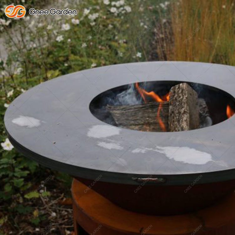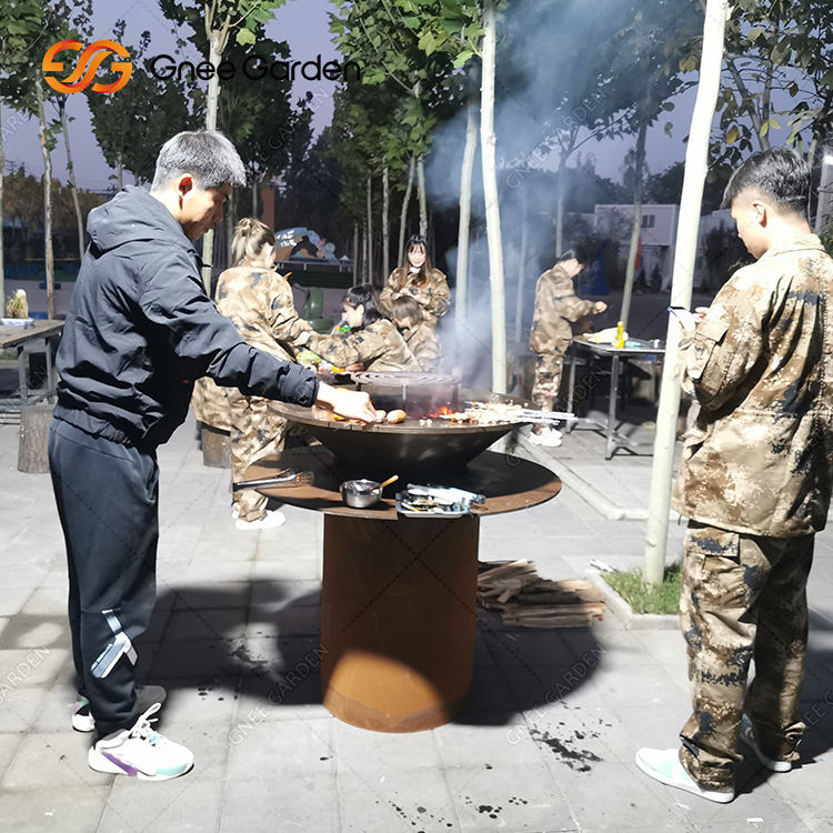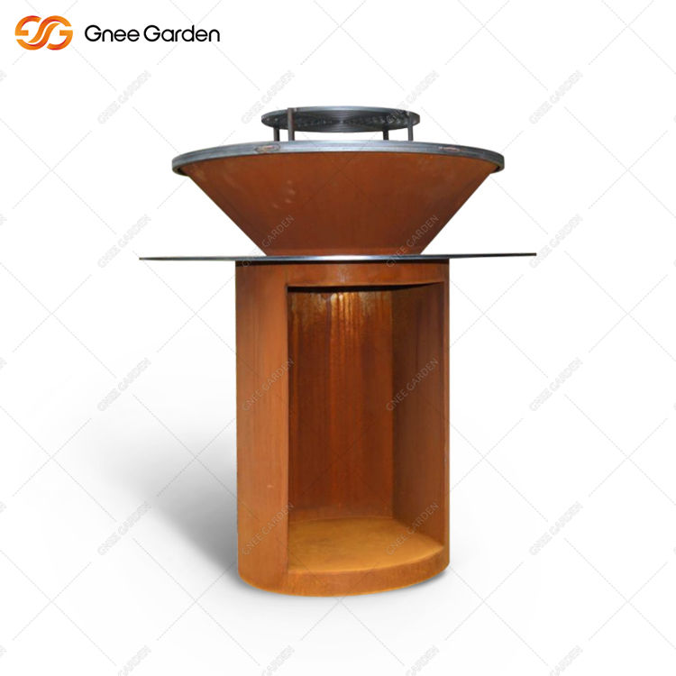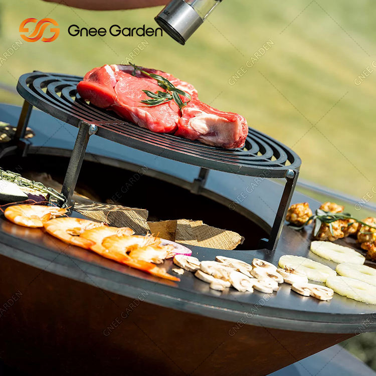 Gnee เตาย่างบาร์บีคิวเหล็กคอร์เทนทันสมัยสำหรับใช้ในสวนปรับความสูงได้อัตโนมัติพื้นผิวย่างไม่ติดกระทะการออกแบบเปลวไฟ