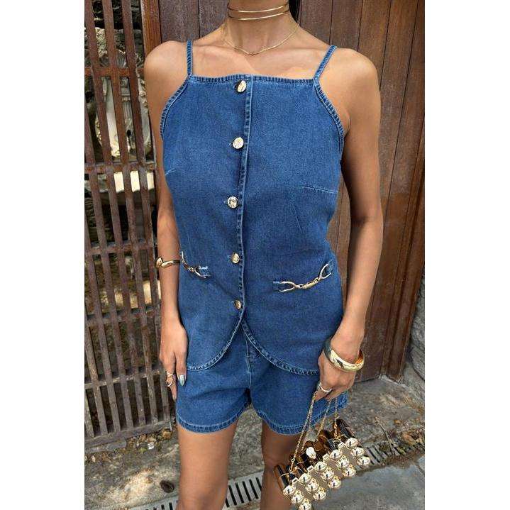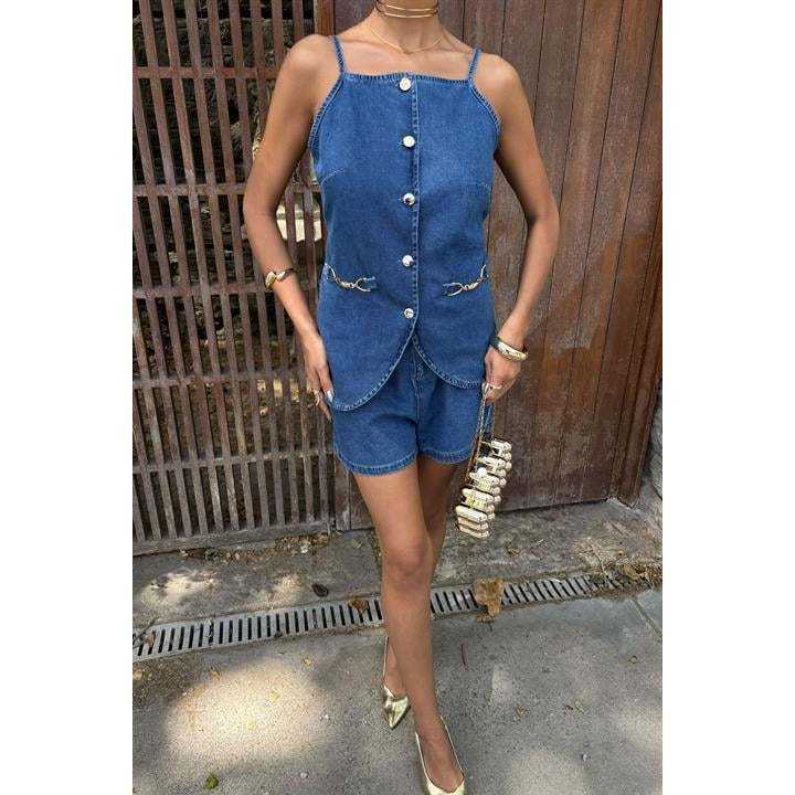 ชุดเสื้อครอปยีนส์และกางเกงขาสั้นติดกระดุม รุ่น 10173 พร้อมเครื่องประดับสีทองและดีเทลแฟชั่น