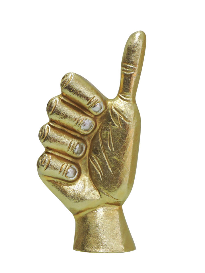 ประติมากรรมรูปมือทำจากอะลูมิเนียมสีทอง รูปปั้นนิ้วชี้ขึ้น ของตกแต่งบ้าน สำนักงาน ชั้นวางของ ของประดับตกแต่งสไตล์โมเดิร์น