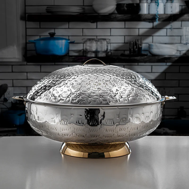 Gold Arabic Casserole Stainless Steel And Wood Food Server with Brass Floral Pattern Handle HotCase and HotPot