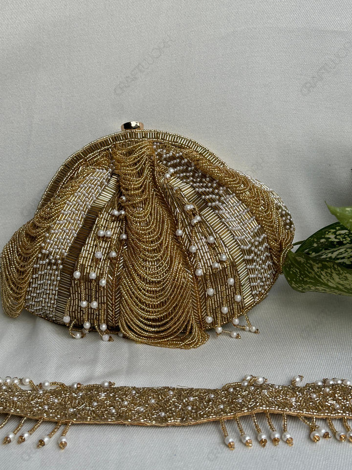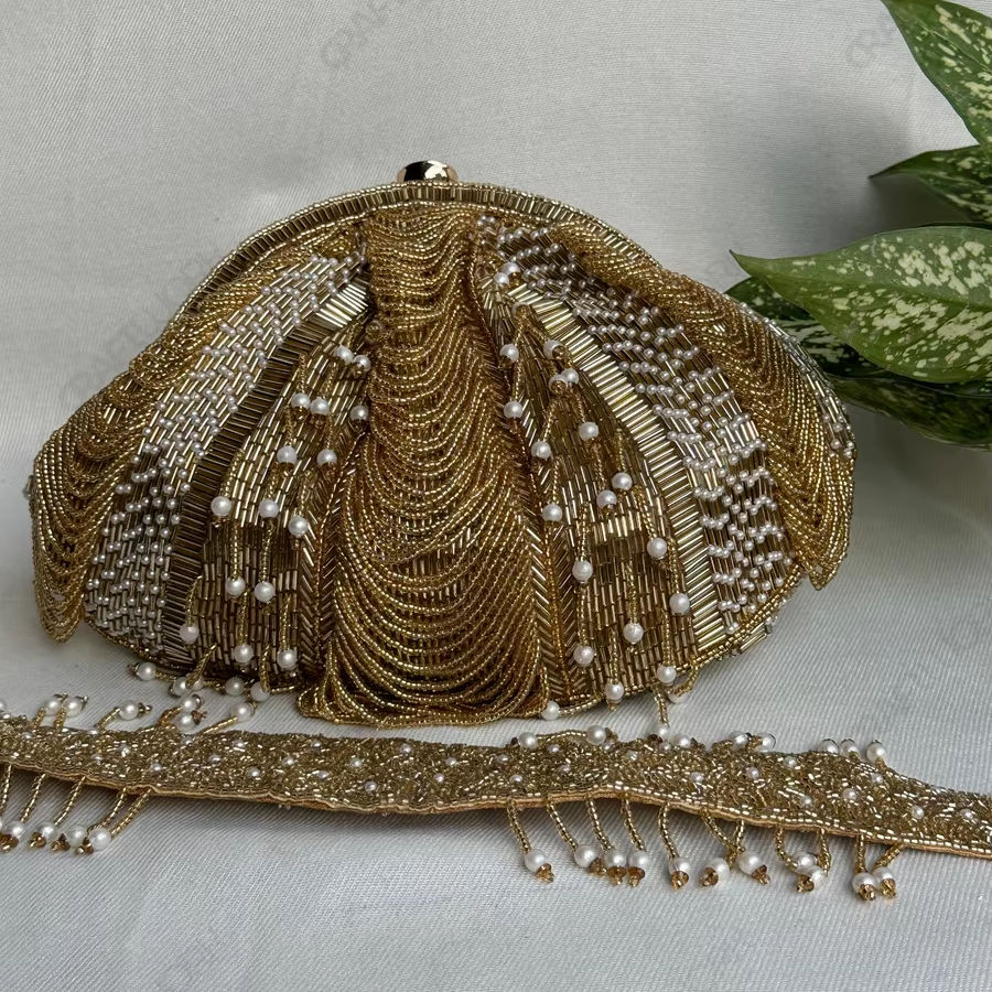 กระเป๋าคลัทช์เจ้าสาวประดับลูกปัดทอง ดีไซน์หรูหราประดับมุก กระเป๋าถือสำหรับงานเลี้ยงตอนเย็น กระเป๋าสำหรับงานแต่งงานสุดหรูสำหรับผู้หญิง