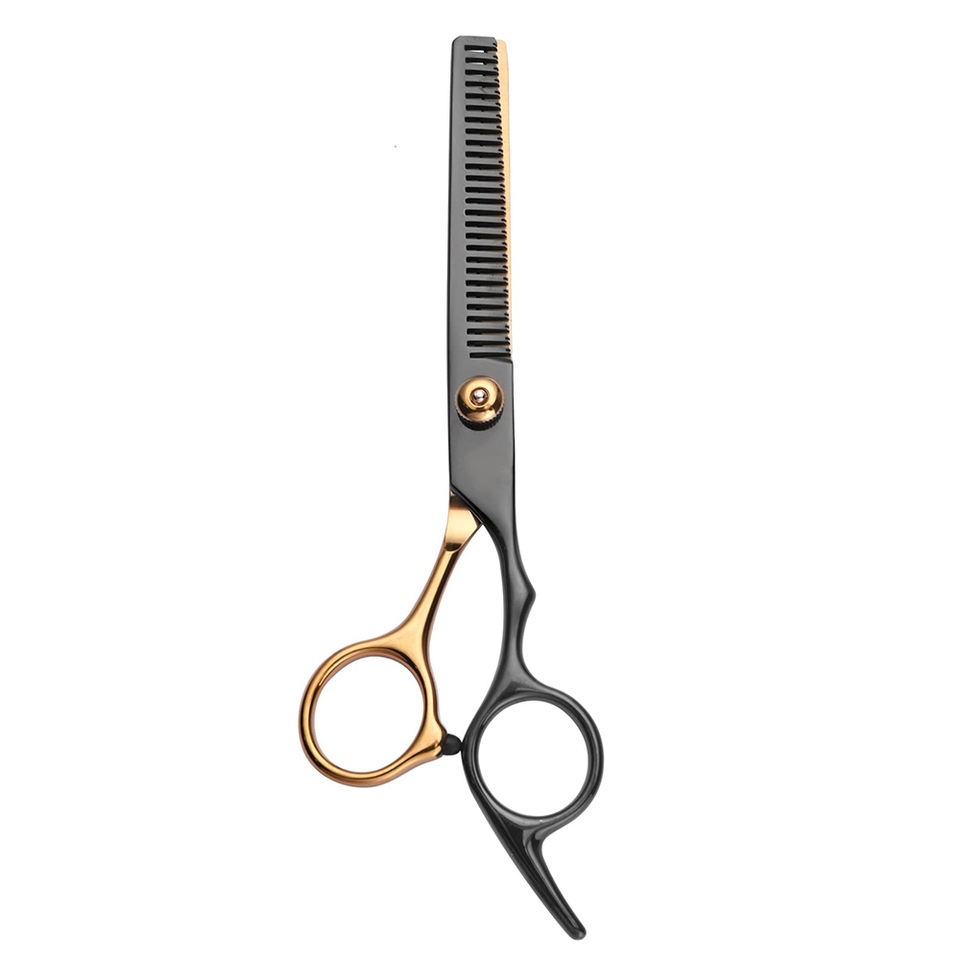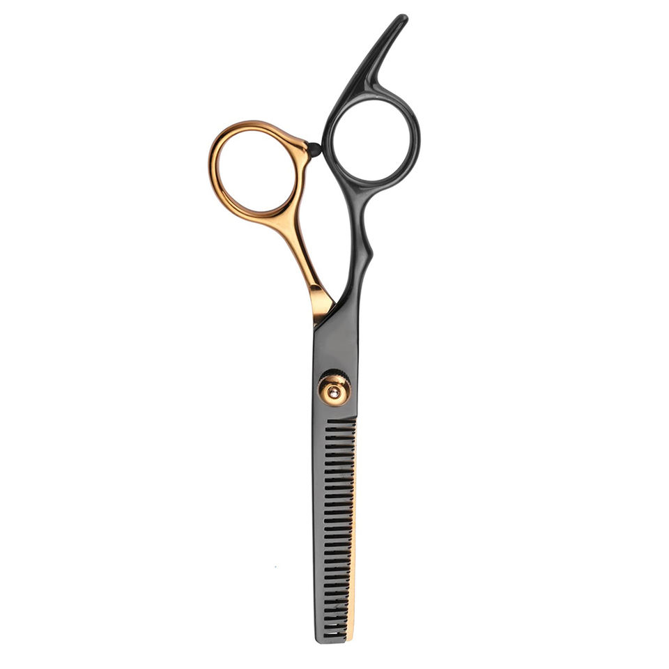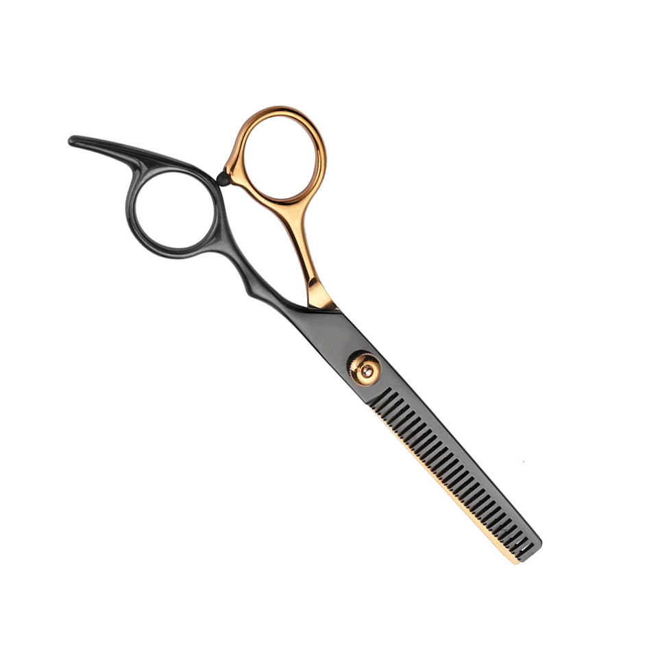 กรรไกรเล็มผมสแตนเลสสตีลสีทอง & สีดำเครื่องมือตัดผมปลายใบมีดคมพร้อมที่วางนิ้วที่สบาย