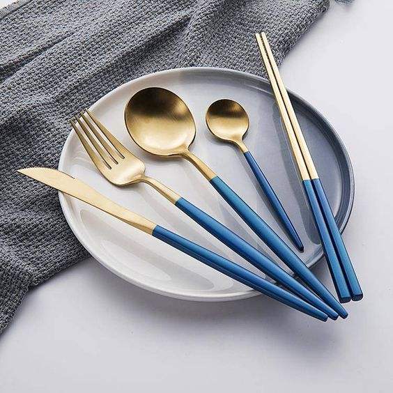 Gold Blue Japandi Cutlery Set Thin Look Latest Style Modern Flatware Sets For Wedding Christmas Party Decor Reusable Cutlery Set