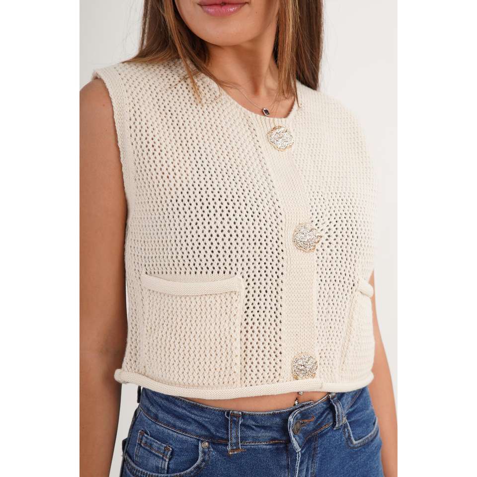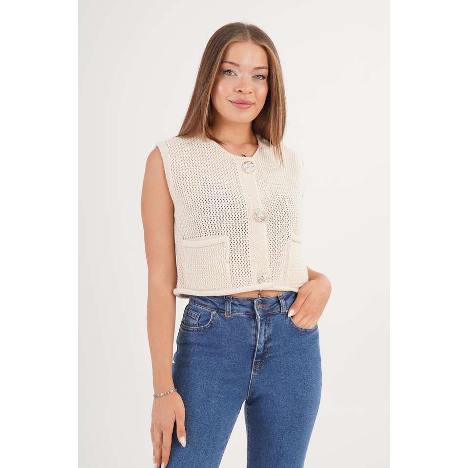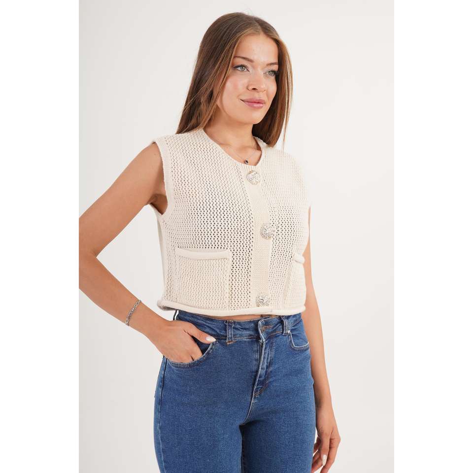 เสื้อกั๊กถักติดกระดุมสีทองพร้อมกระเป๋าคู่ เสื้อคลุมระบายอากาศสำหรับผู้หญิง อะคริลิก 100%