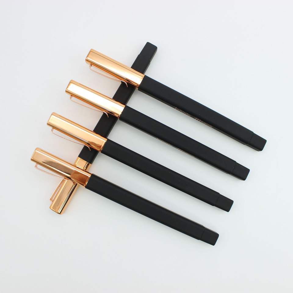 ปากกาลูกลื่นทรงสี่เหลี่ยมสีทอง ตัวด้ามสีดำ ผิวสัมผัสแบบยาง ดีไซน์แปลกใหม่ ตัวเครื่องทำจากพลาสติก รับสกรีนโลโก้ ของขวัญ