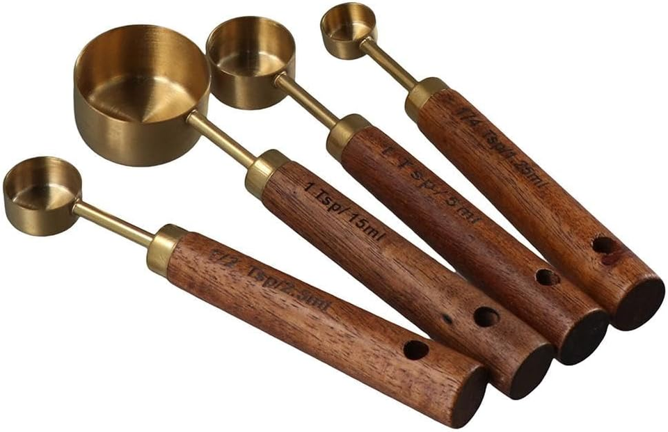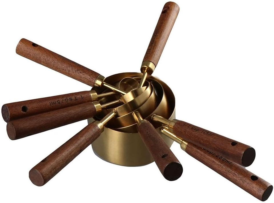 ถ้วยตวงและช้อนตวงสแตนเลสสีทอง ด้ามจับไม้วอลนัท เป็นมิตรกับสิ่งแวดล้อม อุปกรณ์ทำขนมในครัว