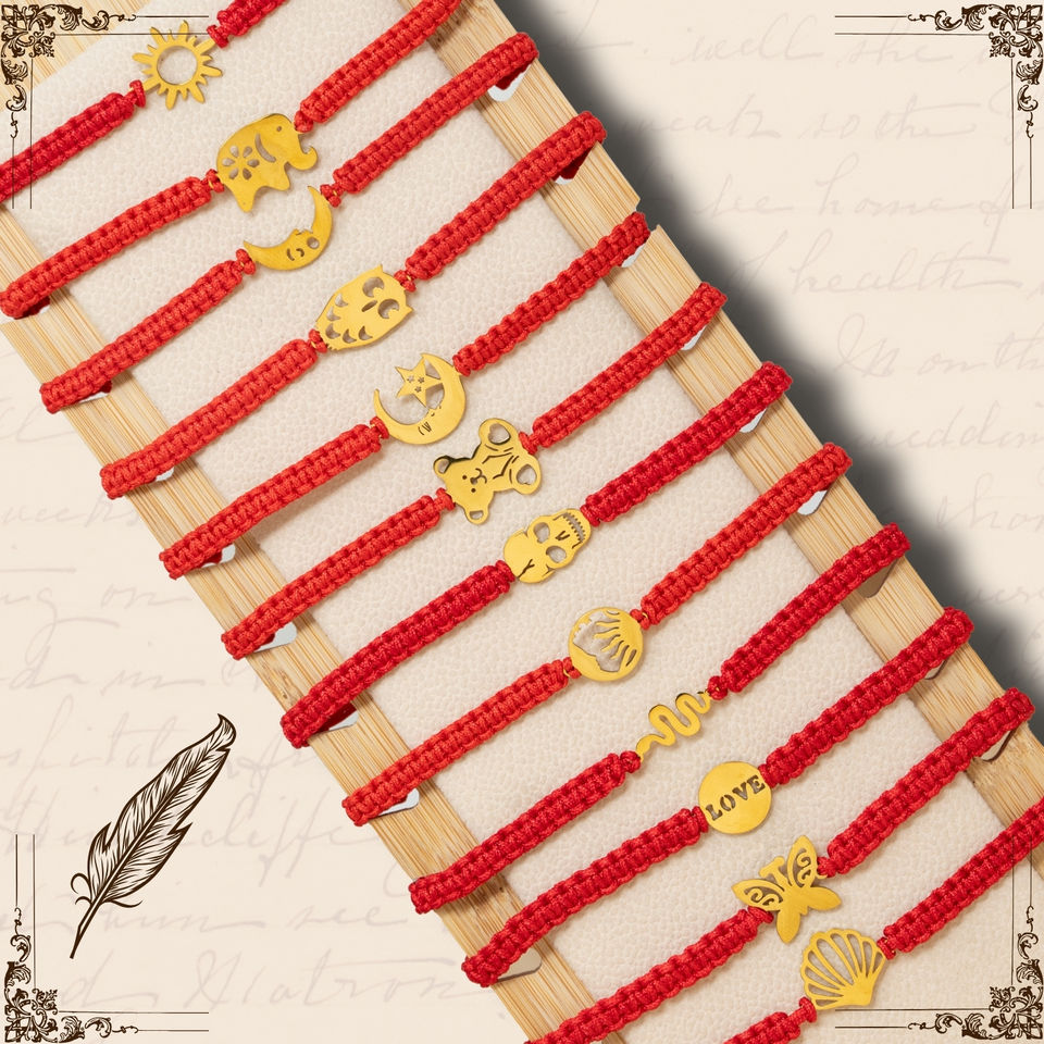 สร้อยข้อมือสแตนเลสสีทองพร้อมด้ายสีแดงและเข็มกลัดรูปมือฟาติมาเพื่อความโชคดีและการปกป้อง