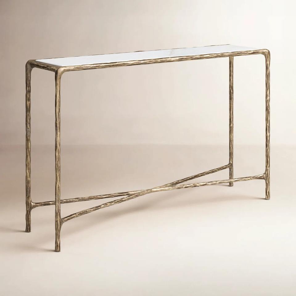 โต๊ะคอนโซลสีทอง ท็อปหินอ่อนสีขาว โครงโลหะแบบตอกลาย เฟอร์นิเจอร์ทางเข้าสไตล์โมเดิร์นแกลม