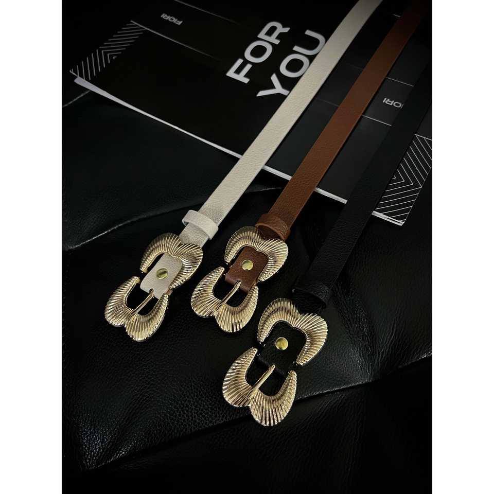 เข็มขัดหนังแท้หัวเข็มขัดคู่สีทอง หนังวัวแท้ ดีไซน์เรียบง่ายสำหรับผู้หญิง หัวเข็มขัดรูปทรงพิเศษแบบสองง่าม