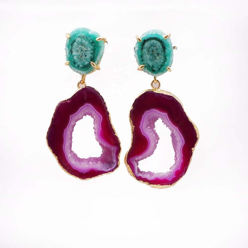 ต่างหูห้อยประดับพลอยควอตซ์ทรงจีโอดชุบทองบนทองเหลือง ของขวัญงานแต่งงานสุดคลาสสิก เครื่องประดับแฟชั่นสำหรับผู้หญิง