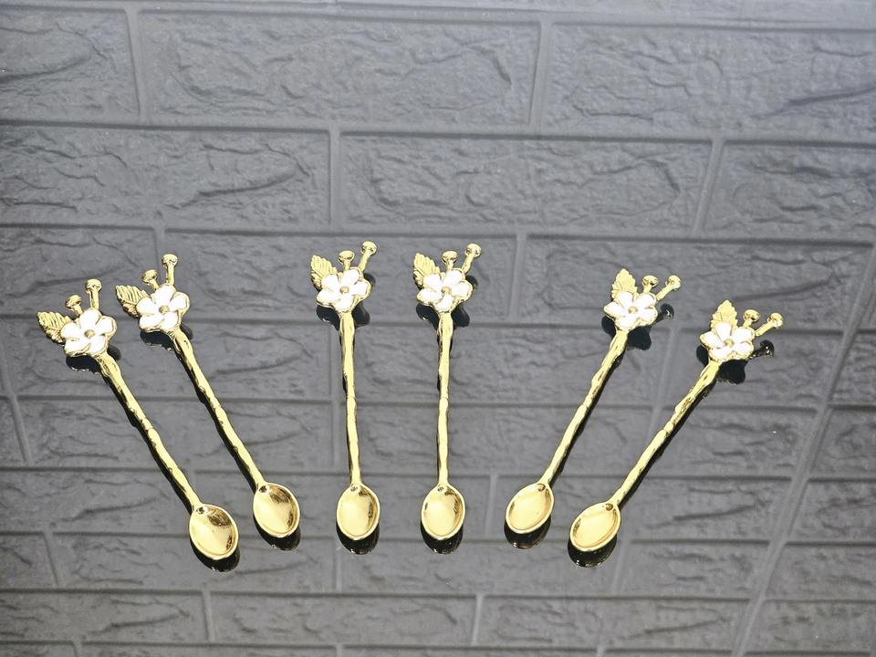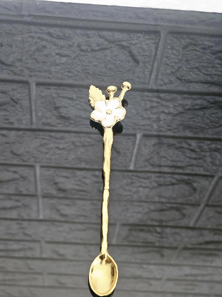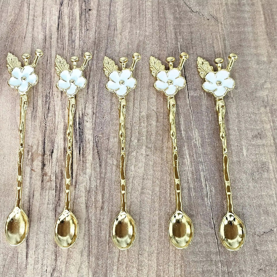 ช้อนสแตนเลสสตีลสีทองพร้อมดีไซน์ดอกไม้สีขาวช้อนชาที่หรูหราเหมาะสำหรับการรับประทานอาหารในห้องครัวและของขวัญ