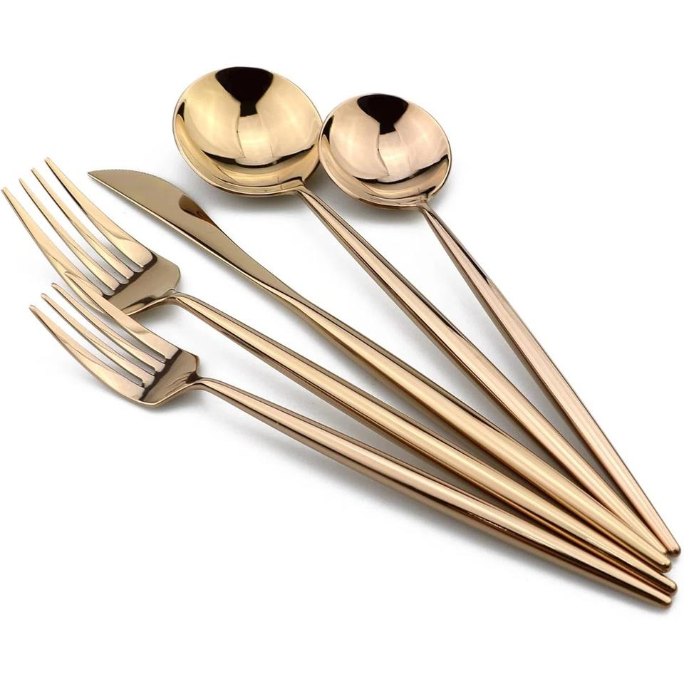 ชุดเครื่องใช้บนโต๊ะอาหารสีทอง5ชิ้นชุดช้อนส้อมสแตนเลสสุดหรูพร้อมที่จับเรียวยาวสำหรับรับประทานอาหารในบ้านงานแต่งงานงานปาร์ตี้