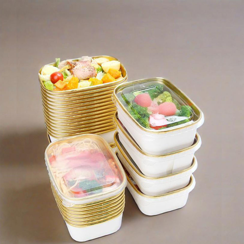 กล่องบรรจุอาหารแบบใช้แล้วทิ้งเคลือบทองคำ กล่องกระดาษคราฟท์ทรงสี่เหลี่ยมสำหรับใส่สลัด ชามกระดาษแบบมีฝาปิด