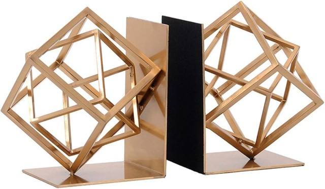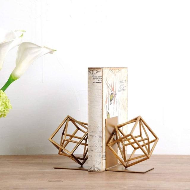 ที่กั้นหนังสือโลหะรูปทรงเรขาคณิตสีทองมีการตกแต่งรูปทรงลูกบาศก์ที่ทันสมัยมีที่กั้นหนังสือสำหรับสำนักงานบ้านห้องสมุดของตกแต่งชั้นวางหนังสือ