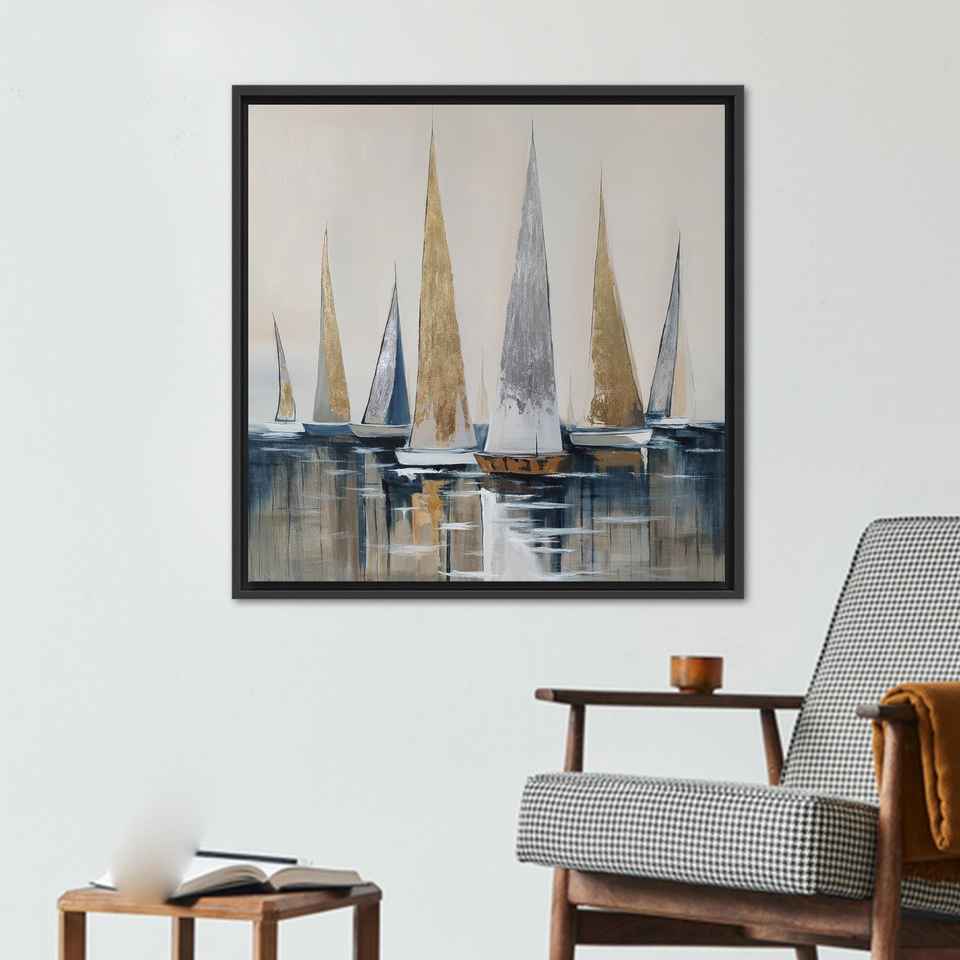 งานศิลปะบนผ้าใบพิมพ์ลายเรือใบแบบนามธรรมสีทองและสีเทา ภาพพิมพ์บนผ้าใบกรอบสีดำ