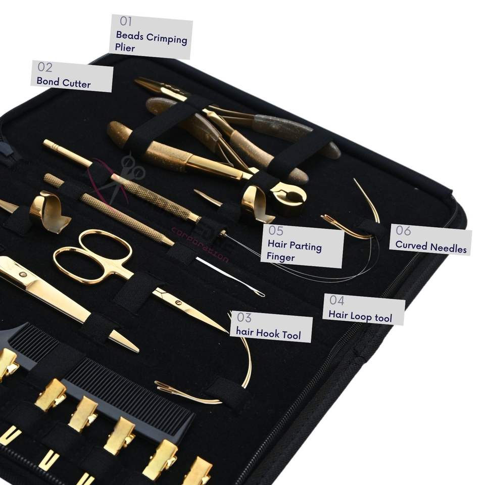 ชุดอุปกรณ์ต่อผมสีทอง พร้อมที่ใส่ไมโครริงและที่ถอดไมโครริง ที่ร้อยห่วง ตะขอเกี่ยว กรรไกรขนาดเล็ก และคลิปหนีบผมสำหรับร้านเสริมสวย